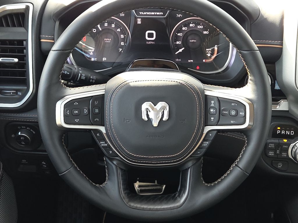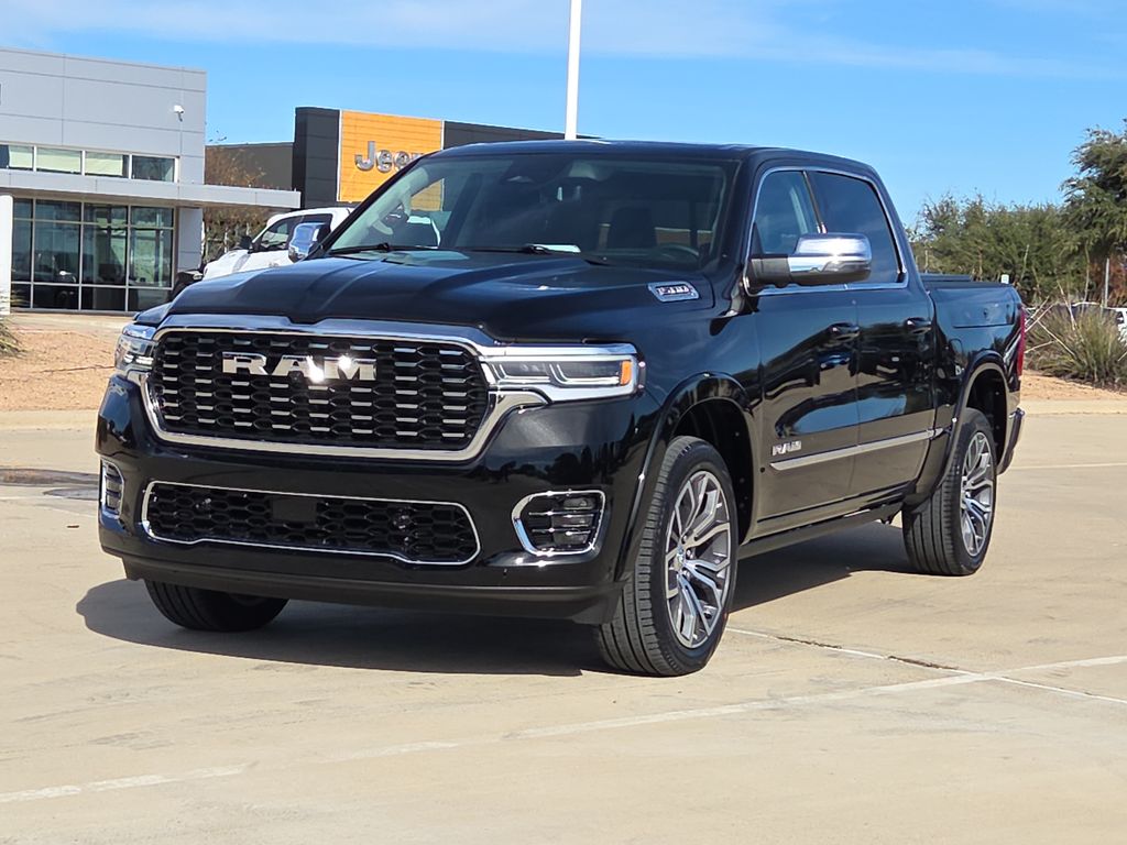 2026 Ram 1500 Tungsten 4D Crew Cab Diamond Black Crystal Pearlcoat 4WD 8-Speed Automatic 3.0L I6 This vehicle comes well equipped with Bed Utility Group (Exterior 115V AC Outlet, MOPAR 4 Adjustable Cargo Tie-Down Hooks, and Truck Bed Cargo Divider), Quick Order Package 22V Tungsten, 1500 Tungsten, 4D Crew Cab, 3.0L I6, 4WD, Diamond Black Crystal Pearlcoat, and Black Leather Bed Utility Group (Exterior 115V AC Outlet, MOPAR 4 Adjustable Cargo Tie-Down Hooks, and Truck Bed Cargo Divider), Quick Order Package 22V Tungsten, 1500 Tungsten, 4D Crew Cab, 3.0L I6, 4WD, Diamond Black Crystal Pearlcoat, Black Leather, 12-Way/1-Way Trailer Connector, 3.92 Rear Axle Ratio, 4-Wheel Disc Brakes, ABS brakes, Adjustable pedals, Air Conditioning, Alloy wheels, AM/FM radio, Apple CarPlay/Android Auto, Audio memory, Auto High-beam Headlights, Auto Power-Folding Mirrors, Auto-dimming door mirrors, Auto-Dimming Exterior Driver Mirror, Auto-dimming Rear-View mirror, Auto-leveling suspension, Automatic temperature control, Bodyside moldings, Brake assist, Bumpers: body-color, Chrome Exterior Mirrors, Compass, Delay-off headlights, Driver door bin, Driver vanity mirror, Dual front impact airbags, Dual front side impact airbags, Electronic Stability Control, Exterior Mirrors Courtesy Lamps, Exterior Mirrors with Heating Element, Exterior Mirrors with Memory, Exterior Mirrors with Supplemental Signals, Exterior Parking Camera Rear, Front anti-roll bar, Front Bucket Seats, Front Center Armrest w/Storage, Front dual zone A/C, Front fog lights, Front License Plate Bracket, Front reading lights, Front wheel independent suspension, Fully automatic headlights, Garage door transmitter, Heads-Up Display, Heated door mirrors, Heated front seats, Heated rear seats, Heated steering wheel, Illuminated entry, Leather steering wheel, Low tire pressure warning, Memory seat, Multi-Function Tailgate, Navigation System, Occupant sensing airbag, Outside temperature display, Overhead airbag, Overhead console, Panic alarm, Passenger door bin, Passenger vanity mirror, Pedal memory, Power adjustable front head restraints, Power door mirrors, Power driver seat, Power moonroof, Power passenger seat, Power steering, Power windows, Premium Leather Bucket Seats, Radio data system, Radio: Uconnect 5 Nav with 14.4" Display, Rain sensing wipers, RAM's Head Badge, Rear anti-roll bar, Rear reading lights, Rear seat center armrest, Rear step bumper, Rear window defroster, Remote keyless entry, Remote Tailgate Release, Security system, Speed control, Split folding rear seat, Steering wheel mounted audio controls, Tachometer, Telescoping steering wheel, Tilt steering wheel, Traction control, Trip computer, Turn signal indicator mirrors, Variably intermittent wipers, Ventilated front seats, Ventilated rear seats, Voltmeter, and Wheels: 22" x 9" Polish/Painted with Inserts.