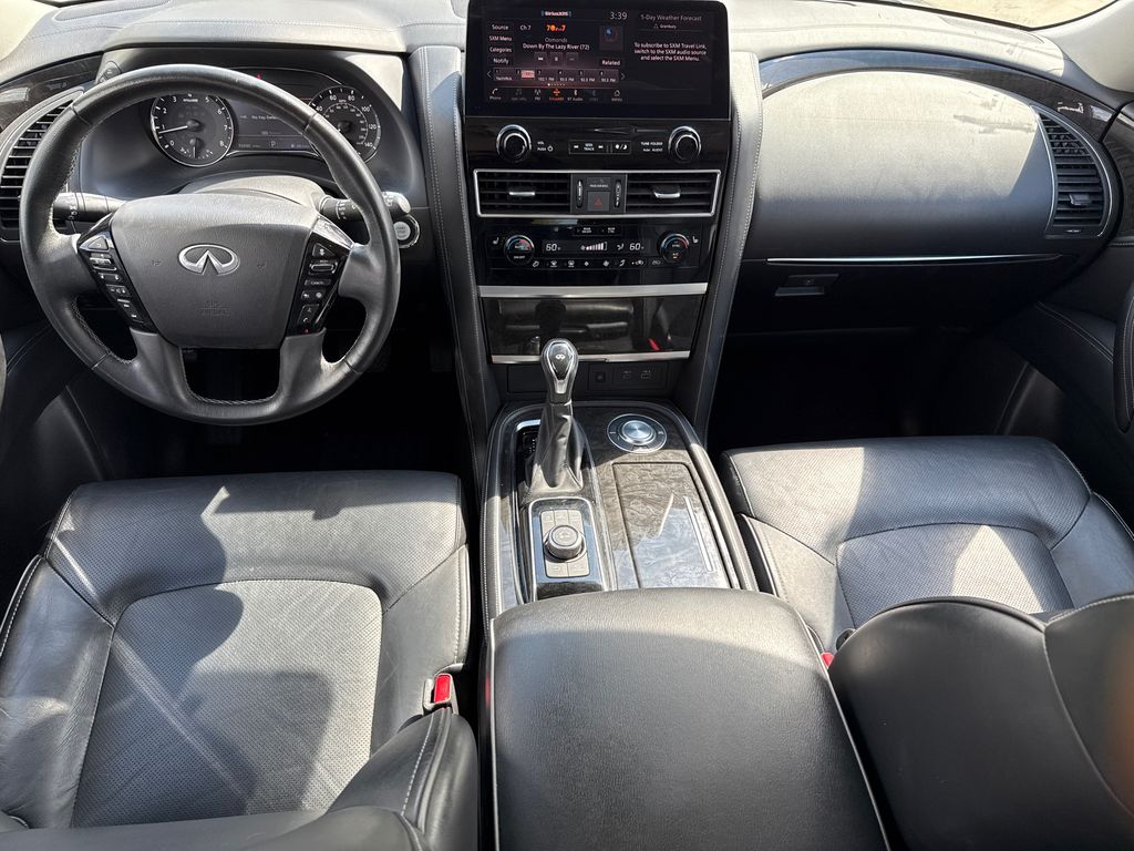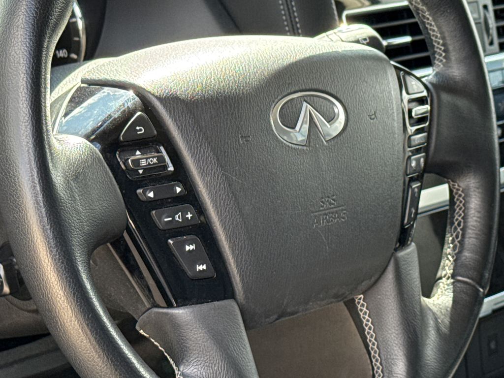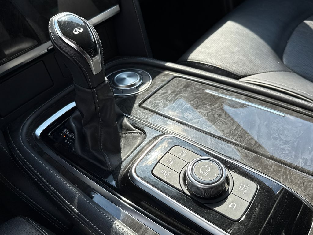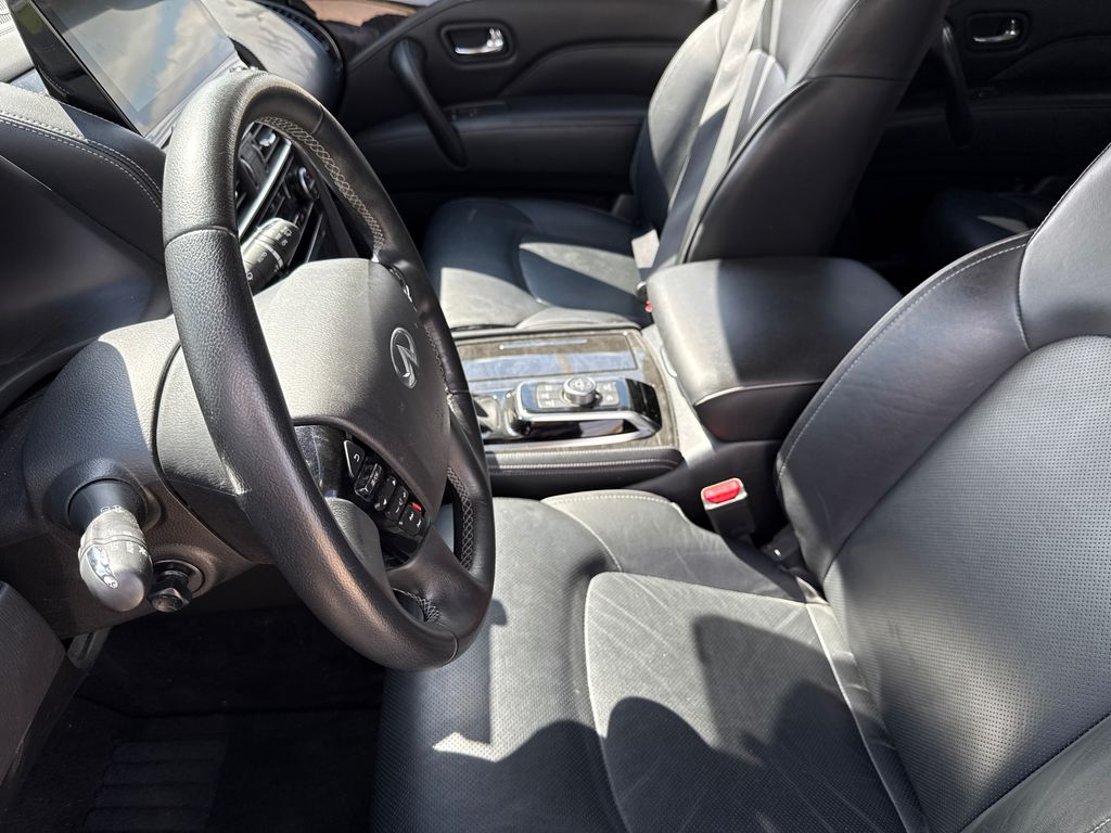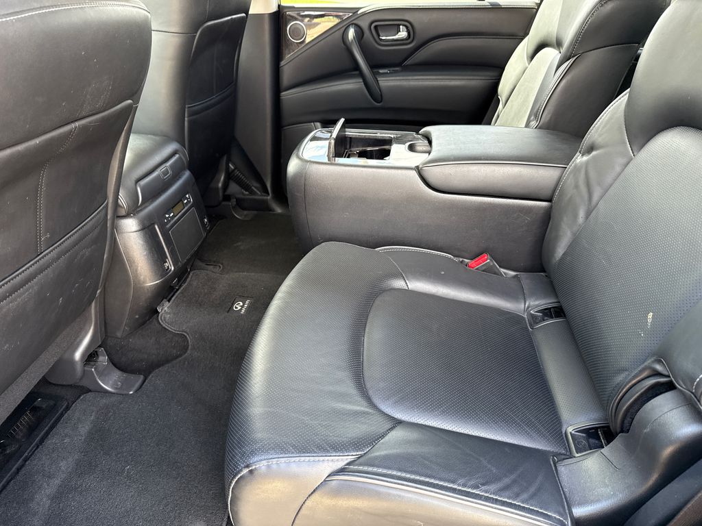 CARFAX One-Owner. APPLE CAR PLAY, ANDROID AUTO, LEATHER INTERIOR, POWER MOONROOF/SUNROOF, LCD DISPLAY SCREEN, POWER DRIVER'S SEAT, POWER PASSENGER SEAT, HEATED FRONT SEATS, REAR A/C, BLIND SPOT MONITOR, BACK UP CAMERA, 3RD ROW SEAT, WELL MAINTAINED. This vehicle comes well equipped with 13 Speakers, 2.937 Axle Ratio, 20" Aluminum Alloy Wheels, 3rd row seats: bench, 4-Wheel Disc Brakes, ABS brakes, Air Conditioning, Alloy wheels, AM/FM radio: SiriusXM, Anti-whiplash front head restraints, Apple CarPlay/Android Auto, Auto High-beam Headlights, Auto tilt-away steering wheel, Auto-dimming door mirrors, Auto-dimming Rear-View mirror, Auto-leveling suspension, Automatic temperature control, Brake assist, Bumpers: body-color, Compass, Delay-off headlights, Driver door bin, Driver vanity mirror, Dual front impact airbags, Dual front side impact airbags, Electronic Stability Control, Emergency communication system: INFINITI InTouch, Four wheel independent suspension, Front anti-roll bar, Front Bucket Seats, Front Center Armrest, Front dual zone A/C, Front fog lights, Front reading lights, Fully automatic headlights, Garage door transmitter: HomeLink, Heated door mirrors, Heated Front Bucket Seats, Heated front seats, Heated steering wheel, Illuminated entry, Leather Shift Knob, Leather steering wheel, Leather-Appointed Seats, Literature Kit, Low tire pressure warning, Memory seat, Navigation system: INFINITI InTouch Navigation, Occupant sensing airbag, Outside temperature display, Overhead airbag, Overhead console, Panic alarm, Passenger door bin, Passenger vanity mirror, Power door mirrors, Power driver seat, Power Liftgate, Power moonroof, Power passenger seat, Power steering, Power windows, Radio data system, Radio: Bose Premium Audio System w/13 Speakers, Rain sensing wipers, Rear air conditioning, Rear anti-roll bar, Rear reading lights, Rear seat center armrest, Rear window defroster, Rear window wiper, Reclining 3rd row seat, Remote keyless entry, Security system, Speed control, Speed-sensing steering, Split folding rear seat, Spoiler, Steering wheel memory, Steering wheel mounted audio controls, Tachometer, Telescoping steering wheel, Tilt steering wheel, Traction control, Trip computer, Turn signal indicator mirrors, Variably intermittent wipers, and Voltmeter.