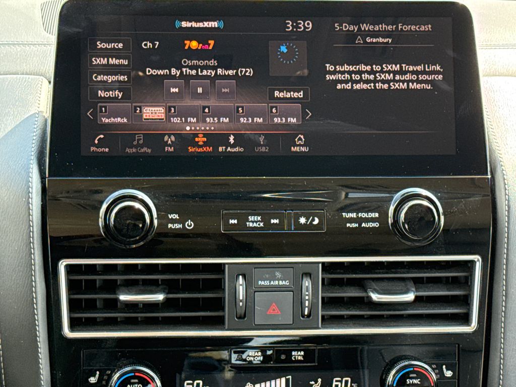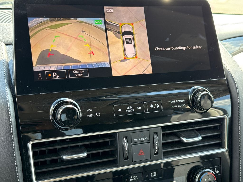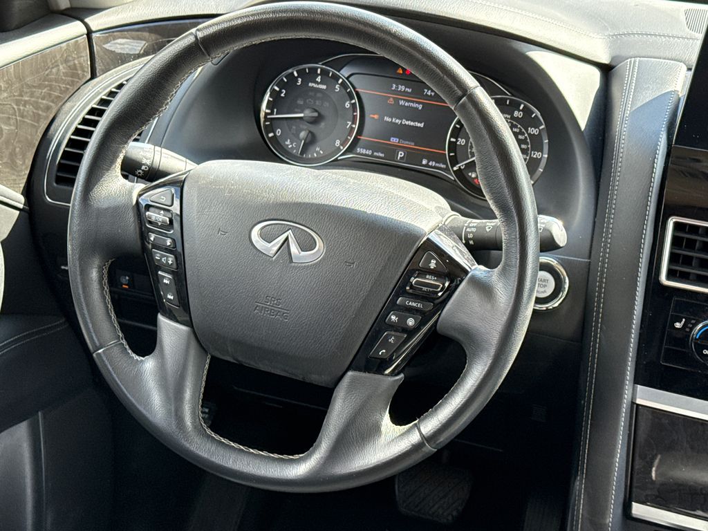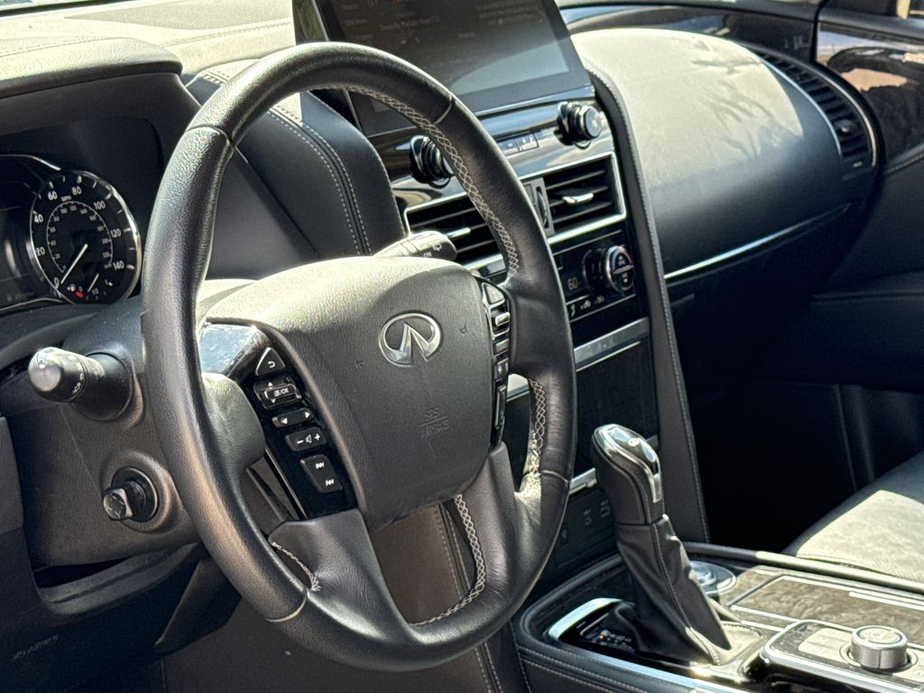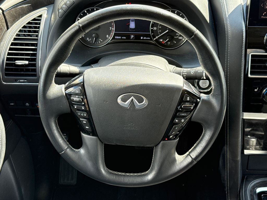 CARFAX One-Owner. APPLE CAR PLAY, ANDROID AUTO, LEATHER INTERIOR, POWER MOONROOF/SUNROOF, LCD DISPLAY SCREEN, POWER DRIVER'S SEAT, POWER PASSENGER SEAT, HEATED FRONT SEATS, REAR A/C, BLIND SPOT MONITOR, BACK UP CAMERA, 3RD ROW SEAT, WELL MAINTAINED. This vehicle comes well equipped with 13 Speakers, 2.937 Axle Ratio, 20" Aluminum Alloy Wheels, 3rd row seats: bench, 4-Wheel Disc Brakes, ABS brakes, Air Conditioning, Alloy wheels, AM/FM radio: SiriusXM, Anti-whiplash front head restraints, Apple CarPlay/Android Auto, Auto High-beam Headlights, Auto tilt-away steering wheel, Auto-dimming door mirrors, Auto-dimming Rear-View mirror, Auto-leveling suspension, Automatic temperature control, Brake assist, Bumpers: body-color, Compass, Delay-off headlights, Driver door bin, Driver vanity mirror, Dual front impact airbags, Dual front side impact airbags, Electronic Stability Control, Emergency communication system: INFINITI InTouch, Four wheel independent suspension, Front anti-roll bar, Front Bucket Seats, Front Center Armrest, Front dual zone A/C, Front fog lights, Front reading lights, Fully automatic headlights, Garage door transmitter: HomeLink, Heated door mirrors, Heated Front Bucket Seats, Heated front seats, Heated steering wheel, Illuminated entry, Leather Shift Knob, Leather steering wheel, Leather-Appointed Seats, Literature Kit, Low tire pressure warning, Memory seat, Navigation system: INFINITI InTouch Navigation, Occupant sensing airbag, Outside temperature display, Overhead airbag, Overhead console, Panic alarm, Passenger door bin, Passenger vanity mirror, Power door mirrors, Power driver seat, Power Liftgate, Power moonroof, Power passenger seat, Power steering, Power windows, Radio data system, Radio: Bose Premium Audio System w/13 Speakers, Rain sensing wipers, Rear air conditioning, Rear anti-roll bar, Rear reading lights, Rear seat center armrest, Rear window defroster, Rear window wiper, Reclining 3rd row seat, Remote keyless entry, Security system, Speed control, Speed-sensing steering, Split folding rear seat, Spoiler, Steering wheel memory, Steering wheel mounted audio controls, Tachometer, Telescoping steering wheel, Tilt steering wheel, Traction control, Trip computer, Turn signal indicator mirrors, Variably intermittent wipers, and Voltmeter.