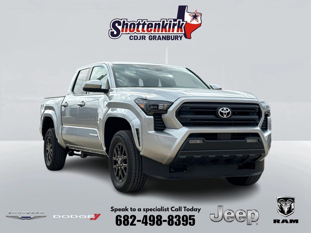 2024 Toyota Tacoma SR5 4D Double Cab Celestial Silver Metallic 2.4L 4-Cylinder 8-Speed Automatic 4WD This vehicle comes well equipped with Tacoma SR5, 4D Double Cab, 2.4L 4-Cylinder, 4WD, Celestial Silver Metallic, Boulder w/Fabric Seat Trim, 6 Speakers, ABS brakes, Alloy wheels, AM/FM radio: SiriusXM, Bumpers: body-color, Electronic Stability Control, Heated door mirrors, Illuminated entry, Low tire pressure warning, Power door mirrors, Radio: 8" Toyota Audio Multimedia, Rear step bumper, Remote keyless entry, and Traction control Tacoma SR5, 4D Double Cab, 2.4L 4-Cylinder, 4WD, Celestial Silver Metallic, Boulder w/Fabric Seat Trim, 6 Speakers, ABS brakes, Alloy wheels, AM/FM radio: SiriusXM, Bumpers: body-color, Electronic Stability Control, Heated door mirrors, Illuminated entry, Low tire pressure warning, Power door mirrors, Radio: 8" Toyota Audio Multimedia, Rear step bumper, Remote keyless entry, Traction control, 3.583 Axle Ratio, 4-Wheel Disc Brakes, Air Conditioning, Anti-whiplash front head restraints, Apple CarPlay/Android Auto, Auto High-beam Headlights, Auto-dimming Rear-View mirror, Brake assist, Driver door bin, Dual front impact airbags, Dual front side impact airbags, Emergency communication system: Safety Connect (1-year trial), Exterior Parking Camera Rear, Four wheel independent suspension, Front anti-roll bar, Front Bucket Seats, Front Center Armrest, Front fog lights, Front reading lights, Fully automatic headlights, Knee airbag, Occupant sensing airbag, Outside temperature display, Overhead airbag, Overhead console, Panic alarm, Passenger door bin, Power steering, Power windows, Rear window defroster, Speed control, Speed-sensing steering, Split folding rear seat, Steering wheel mounted audio controls, Tachometer, Telescoping steering wheel, Tilt steering wheel, Trip computer, Variably intermittent wipers, and Wheels: 17" Styled Alloy. For more information contact one of our Internet Managers at 682-498-8390 to set up your VIP Test Drive.. At SHOTTENKIRK CDJR Granbury located in Granbury, TX all of our Pre-Owned vehicles go through a 100 point plus inspection. The oil and filter are changed, complete brake inspection, tire rotation, safety inspection and all fluid levels are topped off. If we find anything that needs attention we address the issue and fix it. So buy with confidence that you are getting a quality vehicle. We can do a complete walk around for you over the phone. Trade ins are always welcomed. We offer financing from over 25 finance and credit unions locally and nationally. SHOTTENKIRK CDJR 4970 E HWY 377 GRANBURY TEXAS 76049.